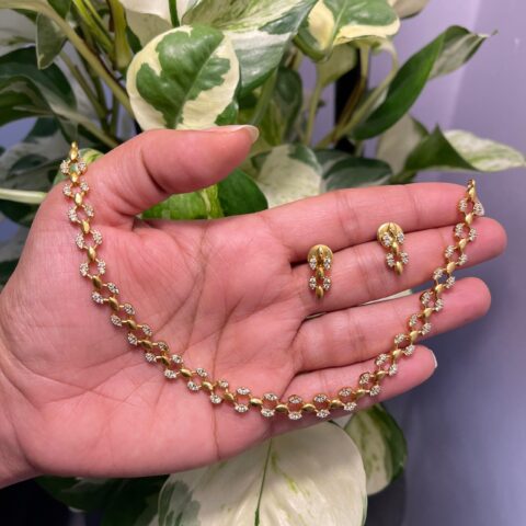 Beautiful AD diamond gold plated necklace and earrings set featuring a sleek linked pattern with sparkling stones. Perfect for party, wedding and festive occasions, adding a touch of elegance and shine to any outfit.