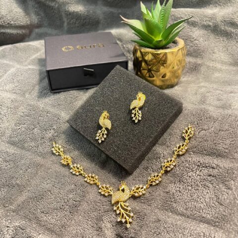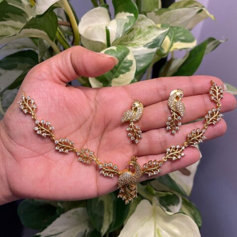 This AD diamond gold plated jewellery set features a graceful peacock design with leaf-pattern detailing and sparkling stones. The artistic craftsmanship and rich gold tone make it a perfect choice for festive, wedding, and party looks.