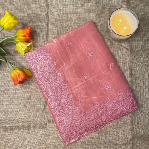 The body of the saree is adorned with delicate thread work motifs, adding a subtle yet luxurious touch. The highlight of the saree is its beautifully embroidered floral border, intricately detailed with fine thread work that enhances the overall richness of the design. The combination of textured fabric and elegant embroidery makes this saree ideal for both day and evening occasions.