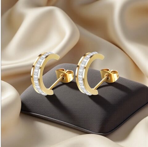Elegant and radiant, these 18K gold-plated stud earrings combine sleek design with sparkling sophistication. The cubic zirconia insets catch the light beautifully, adding a refined shimmer to your look. Lightweight and comfortable, they are crafted to be hypoallergenic and durable, ensuring long-lasting shine and wear. Perfect for both everyday elegance and special occasions, these earrings bring a touch of effortless glamour to any outfit.
