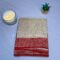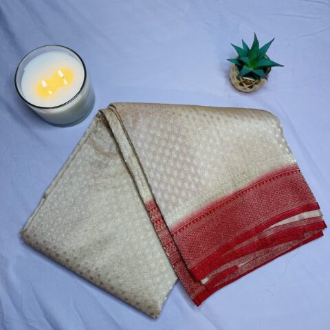 The saree features minimal golden zari weaving with delicate traditional motifs complemented by a striking coral red border that enhances its traditional appeal. Its refined colour combination makes it suitable for weddings festive celebrations religious functions parties and formal occasions.