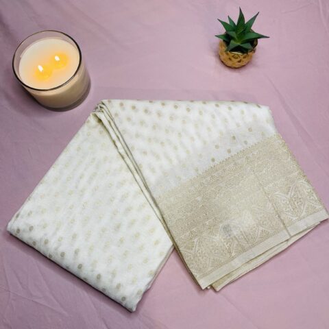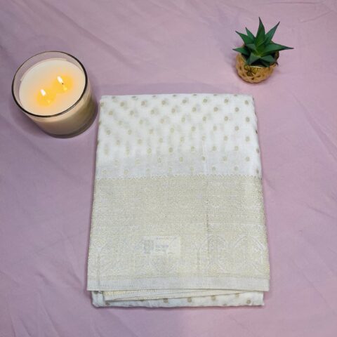 The saree features minimal golden zari weaving with delicate traditional motifs giving it a refined and elegant look. Its understated design makes it suitable for weddings festive celebrations religious functions parties and formal occasions.