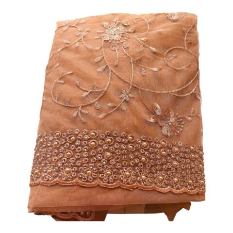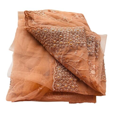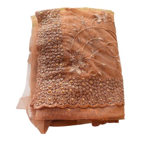 Be the first to review “Elegant Copper Brown / Warm Mocha Lightweight Net Saree with Floral Embroidery & Bead Work”