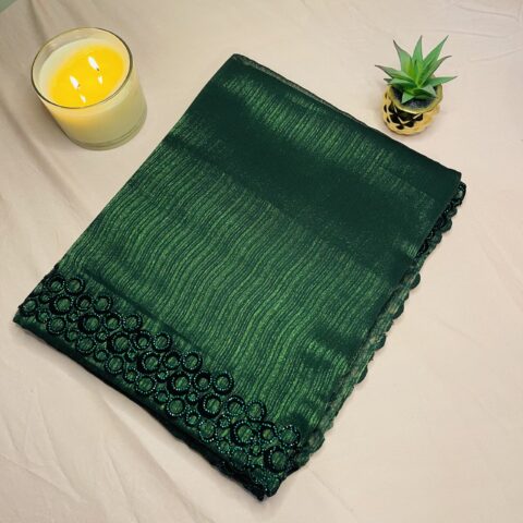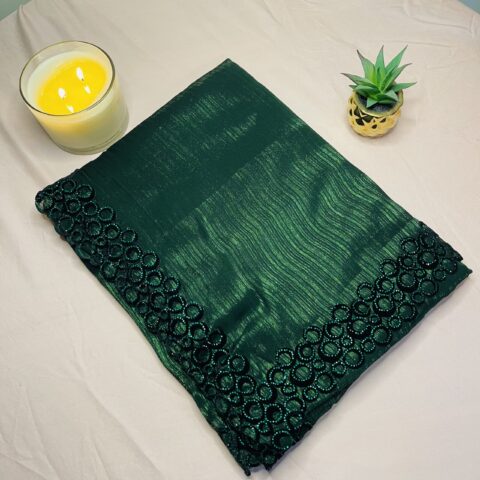 Make a graceful statement with this elegant emerald green shimmer saree designed for modern party wear. Crafted from lightweight shimmer fabric, the saree offers a soft texture with a beautiful shine that enhances its luxurious appeal.