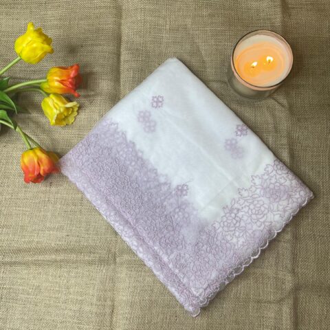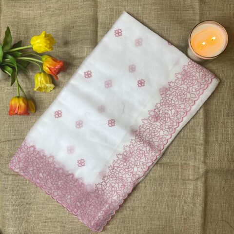 This elegant glass organza saree is crafted from lightweight fabric with a soft sheen, offering a graceful and airy drape. The saree features delicate threadwork along the border, finished with beautifully detailed scalloped edges that add a refined and feminine touch. Designed in soothing pastel shades, it is perfect for festive occasions, day functions, and elegant gatherings. A timeless piece that blends subtle elegance with contemporary style.