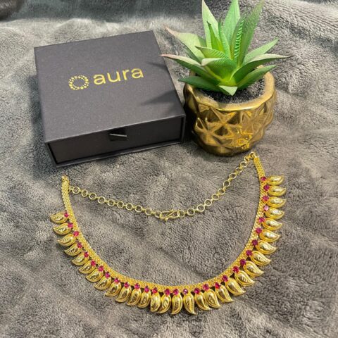This gold plated imitation jewellery necklace features a graceful leaf-inspired design highlighted with rich ruby-tone stones. A classic traditional piece that beautifully complements sarees and ethnic wear for festive and special occasions.