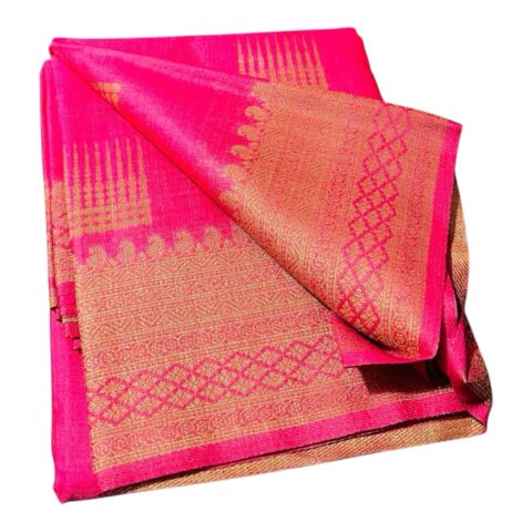 The luxurious silk fabric offers a smooth texture, natural luster, and graceful fall, making it perfect for grand celebrations such as weddings, festive gatherings, and ceremonial occasions. Its vibrant hot pink hue paired with shimmering gold accents creates a regal look that never goes out of style.