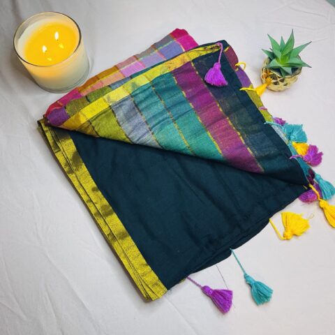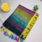 The saree features a vibrant multicolor rainbow print with a subtle checkered pattern, giving it a fresh and cheerful look. Enhanced with a graceful golden border and playful tassels on the pallu, it strikes the perfect balance between simplicity and style.