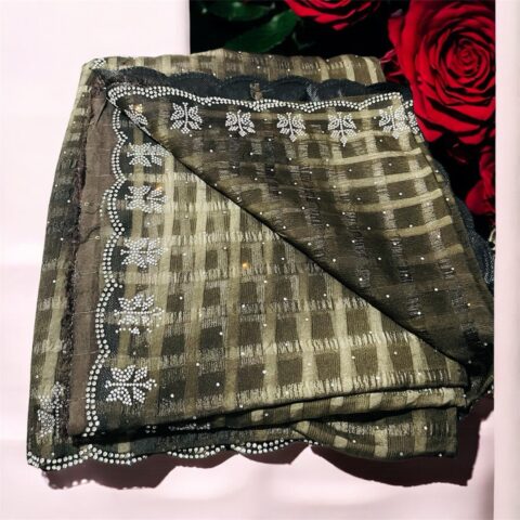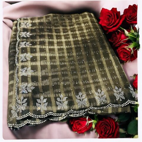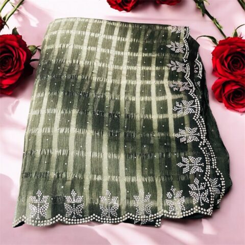 The highlight of this saree is its intricate sugar work (stone work) embellishment, beautifully adorning the scalloped border with floral motifs and sprinkled delicately across the body. Its elegant olive green shade makes it a standout choice for festive occasions, weddings, parties, family functions, and cultural celebrations.