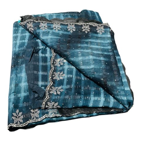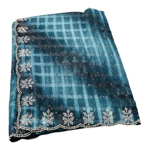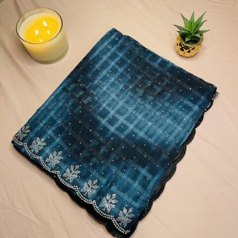 The highlight of this saree is its intricate sugar work (stone work) embellishment, beautifully adorning the scalloped border with floral motifs and sprinkled delicately across the body. Its rich teal blue shade lends a graceful and sophisticated appeal, making it a stunning choice for festive occasions, weddings, parties, family functions, and cultural celebrations.