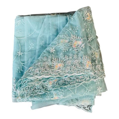 Add timeless elegance to your ethnic wardrobe with this stunning aqua blue Net Cotta Embroidered Saree. Crafted from soft and lightweight net cotta fabric, this saree features exquisite floral and vine embroidery enhanced with delicate beads work that adds a subtle shimmer and rich appeal.