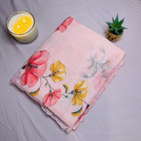 The soothing pastel pink base is beautifully enhanced with artistic floral motifs, giving it a fresh and graceful look. The subtle texture of semi linen ensures a natural drape while maintaining a refined appearance. Whether you’re heading to work, a casual gathering, or a daytime celebration, this saree offers timeless charm with modern comfort.