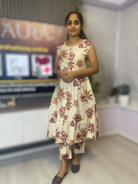 Elegant sleeveless co-ord set crafted from smooth Vatican silk material, designed in a flattering A-line pattern. This stylish printed set comes with sleeve material included, allowing versatile styling as preferred. Perfect for daily wear, office wear, and casual outings, offering both comfort and refined appeal. Available in sizes Medium to XXL.
